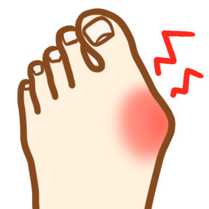 外反母趾とは、足の親指(母趾)が外側に曲がってしまい、付け根の関節が内側に突出する状態をいいます。ひどくなると靴に当たって赤く腫れたり、歩行時に強い痛みを感じるようになります。